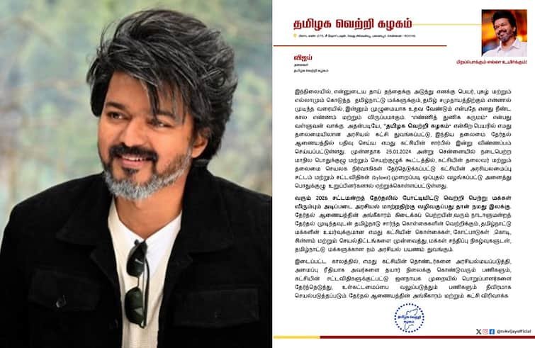 இந்நிலையில், என்னுடைய தாய் தந்தைக்கு அடுத்து எனக்கு பெயர், புகழ் மற்றும் எல்லாமும் கொடுத்த தமிழ்நாட்டு மக்களுக்கும், தமிழ் சமுதாயத்திற்கும் என்னால் முடிந்த வரையில், இன்னும் முழுமையாக உதவ வேண்டும் என்பதே எனது நீண்ட கால எண்ணம் மற்றும் விருப்பமாகும் ‘எண்ணித் துணிக கருமம் என்பது வள்ளுவன் வாக்கு. அதன்படியே, “தமிழக வெற்றி கழகம்” என்கிற பெயரில் எமது தலைமையிலான அரசியல் கட்சி துவங்கப்பட்டு, இந்திய தலைமை தேர்தல் ஆணையத்தில் பதிவு செய்ய எமது கட்சியின் சார்பில் இன்று விண்ணப்பம் செய்யப்பட்டுள்ளது.