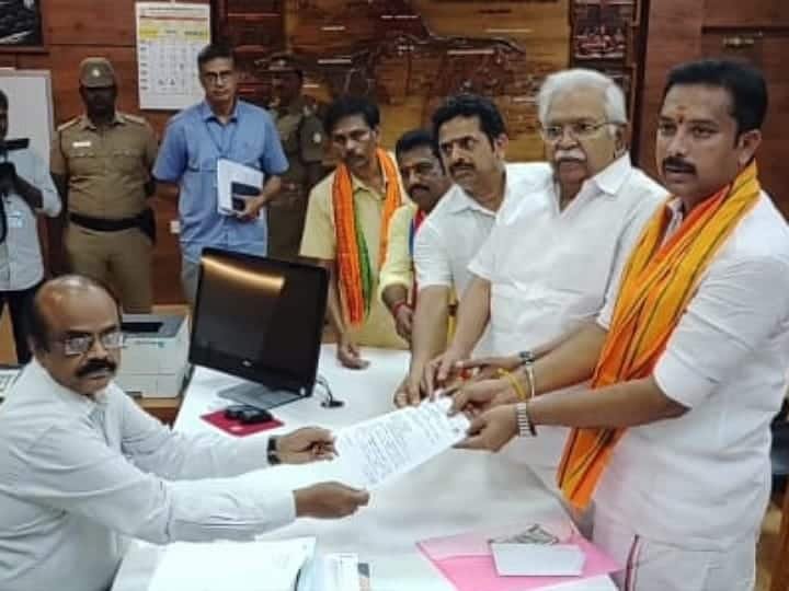<p style="text-align: justify;">அப்போது அங்கு பாதுகாப்பு பணியில் ஈடுபட்டிருந்த போலீசார் வேட்பு மனு தாக்கல் செய்வதற்கு ஐந்து நபர்களுக்கு மட்டுமே அனுமதி என்று கூறியதால் முன்னாள் எம்பி நாட்ராயன், அமமுக, தமாகா உள்ளிட்ட கூட்டணிக் கட்சிகளை சேர்ந்த நிர்வாகிகளுடன் உள்ளே சென்ற பாஜக வேட்பாளர் செந்தில்நாதன் மாவட்ட தேர்தல் நடத்தும் அலுவலர் தங்கவேலிடம் தனது வேட்பு மனுவினை தாக்கல் செய்தார்.</p>