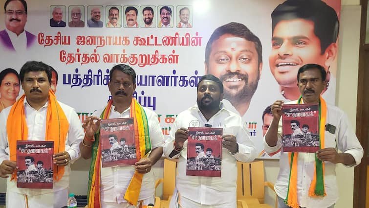 நேற்று பாரதிய ஜனதா கட்சி சார்பில் , கடந்த 10 ஆண்டுகள் செய்த சாதனைகள் மற்றும் தேர்தல் அறிக்கை வெளியானது. இந்த நிலையில் இது தொடர்பாக காஞ்சிபுரம் தனியார் திருமண மண்டபத்தில் மாநிலச் செயலாளர் எஸ் .ஜி. சூர்யா பாஜக தேர்தல் அறிக்கை தொடர்பாக பத்திரிக்கையாளர் சந்திப்பு நடத்தினார். முன்னதாக திராவிட மாடல் சாதனைகள் என்ற பெயரில் கடந்த மூன்று ஆண்டுகளாக திமுக அரசால் நிறைவேற்றப்படாத வாக்குறுதிகள் மற்றும் குற்றச்சாம்பவங்கள் குறித்த அறிக்கையை வெளியிட்டார் .