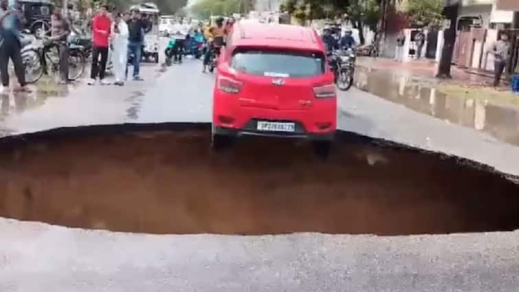 உத்தர பிரதேசம் தலைநகரில் லக்னோவில் உள்ள சாலையில் விழுந்த பள்ளத்தில் கார் ஒன்று சிக்கி கொண்ட வீடியோ சமூக வலைதளத்தில் வைரலாகிவருகிறது.