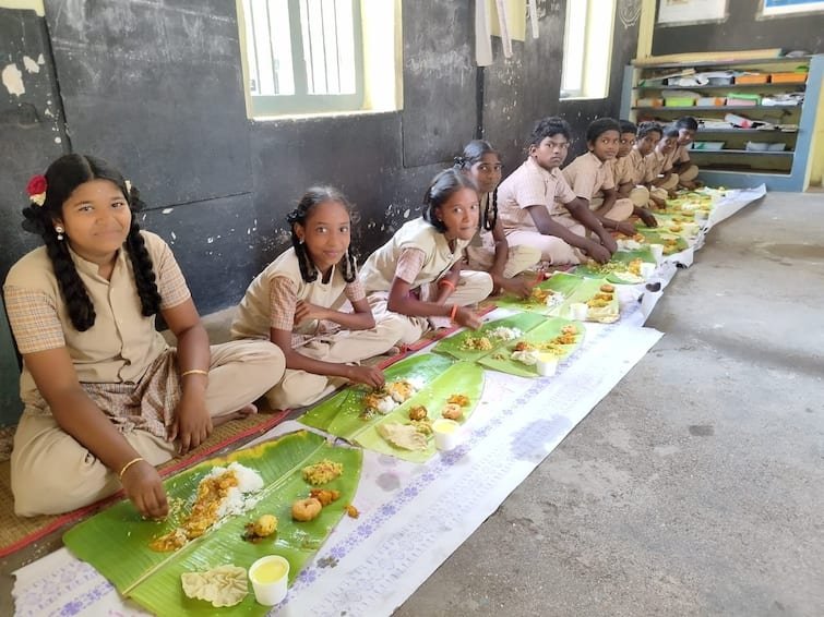 காஞ்சிபுரம் அரசு ஒன்றிய அங்கம்பாக்கம் நடுநிலைப்பள்ளியில் மாணவர்களுக்கு தலைவாழை இலையில் அறுசுவை விருந்து பரிமாறப்பட்டது.