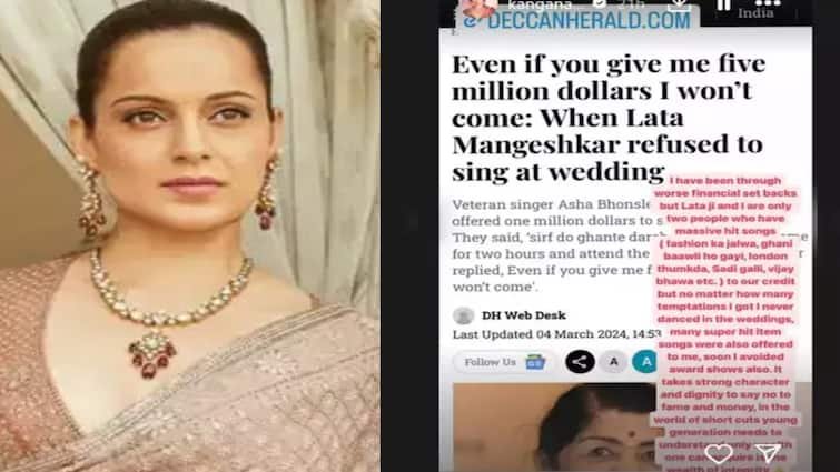 “எத்தனை லட்சம் டாலர் கொடுத்தாலும் நான் திருமண நிகழ்ச்சிகளில் பாட மாட்டேன்” என மிகவும் பிரபலமான பாடகி லதா மங்கேஷ்கர் மறுத்த நிகழ்வை பகிர்ந்த கங்கனா ரனாவத் “நான் பண நெருக்கடியால் சிக்கி தவிக்கிறேன். லதா ஜீயும், நானும் ஏராளமான ஹிட் பாடல்களை வைத்து இருக்கிறோம்.