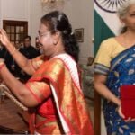Union Finance Minister Nirmala Sitharaman presenting the budget for the 6th time has attractedattention by wearing a Ram colored saree