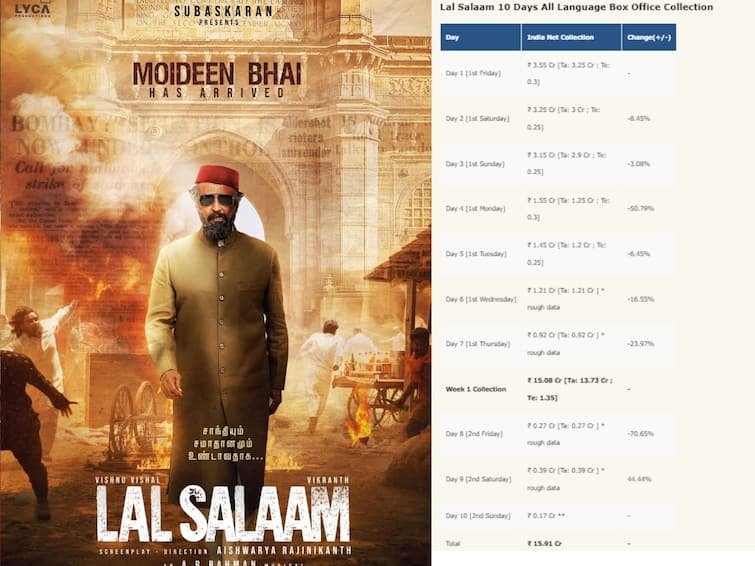 முதல் வாரத்தில் மொத்தம் 15. 08 கோடிகளை வசூல் செய்தது லால் சலாம் . இந்நிலையில் 9 ஆவது நாளான நேற்று 39 லட்சம் படம் வசூல் செய்துள்ளது. இன்று 10 ஆவது நாளில் 17 லட்சம் வரை படம் வசூல் ஈட்டும் என்று இந்த தளத்தில் கூறப்பட்டுள்ளது.