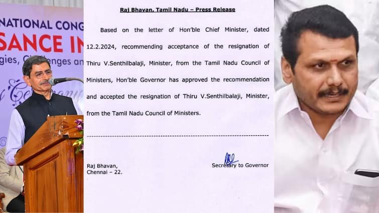 ஆளுநர் மாளிகை வெளியிட்டுள்ள செய்திக் குறிப்பில், ”மாண்புமிகு முதலமைச்சர் அவர்கள், 12.2.2024 அன்று, தமிழ்நாடு அமைச்சர் வி.செந்தில்பாலாஜியின் ராஜினாமாவை ஏற்றுக் கொள்ள பரிந்துரைத்து எழுதிய கடிதத்தின் அடிப்படையில், அந்த பரிந்துரையை மாண்புமிகு ஆளுநர் அவர்கள் அங்கீகரித்து ராஜினாமாவை ஏற்றுக்கொண்டுள்ளார்” என தெரிவிக்கப்பட்டுள்ளது.
