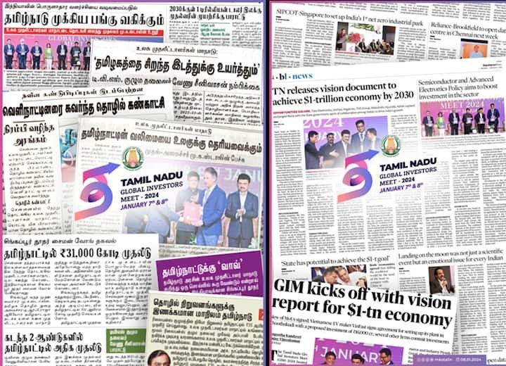 இந்த நிலையில், உலக முதலீடுகளை ஈர்க்கும் தெற்காசியாவின் முதன்மை மாநிலமாக தமிழ்நாடு மாறி உள்ளதாக முதல்வர் ஸ்டாலின் பெருமிதம் தெரிவித்துள்ளார். இதுகுறித்து இன்று அவர் வெளியிட்டுள்ள எக்ஸ் பதிவில், ’’உலக முதலீட்டாளர் மாநாட்டின் முதல் நாள் வெற்றிகரமான மற்றும் குறிப்பிடத்தக்க நிகழ்வுகளின் தொகுப்பாக மாறி உள்ளது. உலக முதலீட்டாளர்கள் மாநாட்டில் தமிழ்நாடு ஈர்த்த மொத்த முதலீடுகள் குறித்து இன்று மாலை நன்றி உரையில் அறிவிக்க உள்ளேன்.