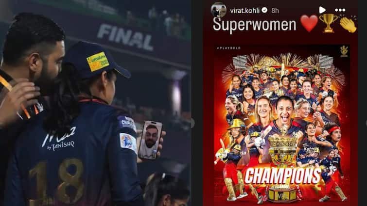 மைதானத்தில் வெற்றிக் களிப்பில் இருந்த ஆர்சிபி மகளிர் அணி வீராங்கனைகளை, விராட் கோலி வீடியோ கால் மூலம் தொடர்பு கொண்டு வாழ்த்து தெரிவித்தார். இதனால், வீராங்கனைகள் மேலும் உற்சாகமடைந்தனர். இதுதொடர்பான வீடியோ தற்போது இணையத்தில் வைரலாகி வருகிறது. அதோடு, தனது இன்ஸ்டாகிரம் பக்கத்தில் ”கோப்பையுடன் கூடிய ஆர்சிபி மகளிர் அணியின் புகைப்படத்தை பதவிட்டு, சூப்பர் வுமன்ஸ்” என பாராட்டியுள்ளார்.